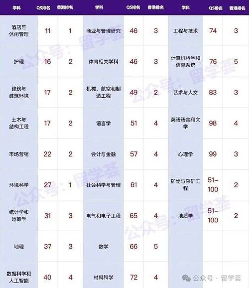 该学科在QS世界大学学科排名中持续位居全球前列,是理大的王牌专业。课程涵盖酒店运营、会展管理、旅游策划等,学生常有机会在五星级酒店集团或知名旅游企业进行为期一年的带薪实习。毕业生就业率接近100%,多数投身于国际酒店管理集团、航空公司、主题公园及会展公司,起薪点优于许多同类专业。